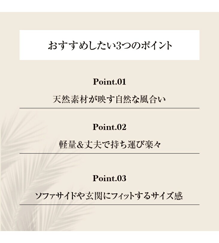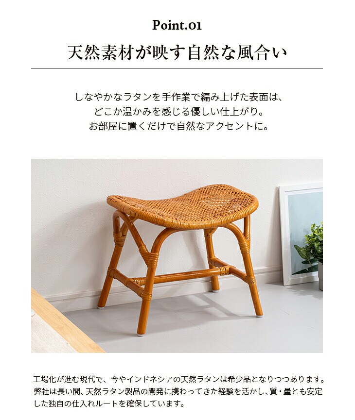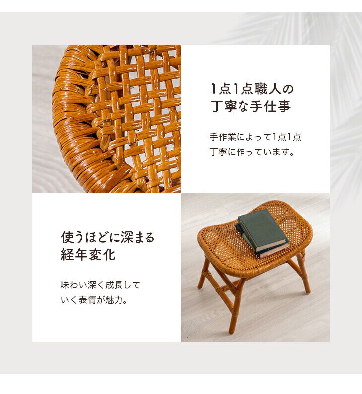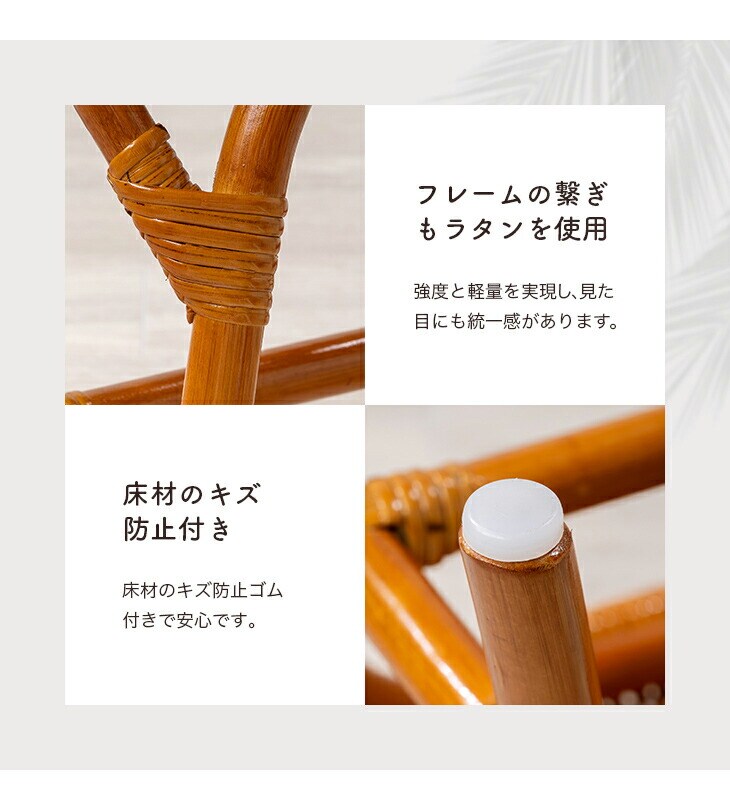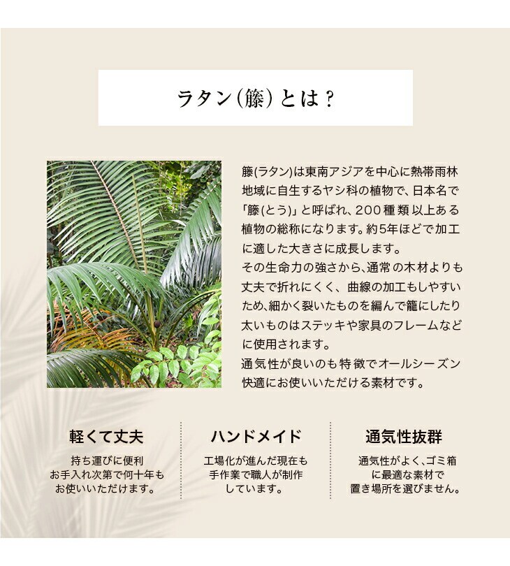 籐(ラタン)ならではの美しい編み目と優しい風合いが、お部屋に温かみとナチュラルな雰囲気をプラスします。どんなインテリアにも馴染みやすいデザインです。