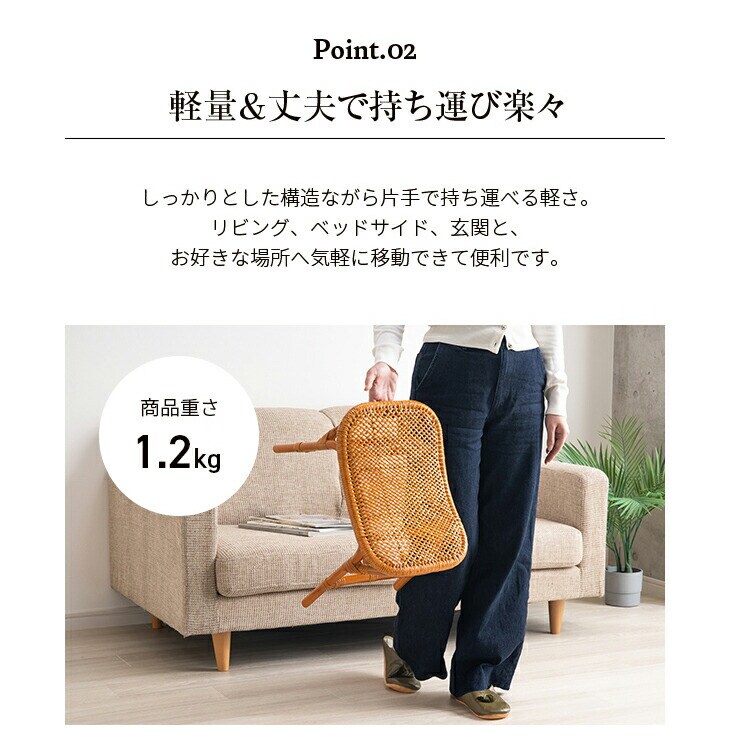 重さわずか約1.2kg!片手でヒョイっと持ち運べる軽さなのに、丈夫で安定感があります。リビング、寝室、玄関など、使いたい場所に気軽に移動できます。