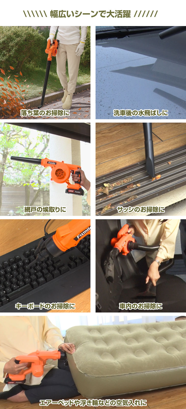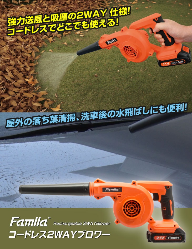 落ち葉掃除、網戸、洗車、DIY、空気入れなど、これ1台で家も外でも快適に!集じん機能付きブロワバキュームのご紹介。ファミラの充電式コードレス2WAYブロワーは、あなたの暮らしをもっと快適にする多機能ツールです。強力な送風機能と便利な吸塵機能を兼ね備えた2WAY仕様!さらに多彩なアタッチメントで家中のあらゆる場面で大活躍します。