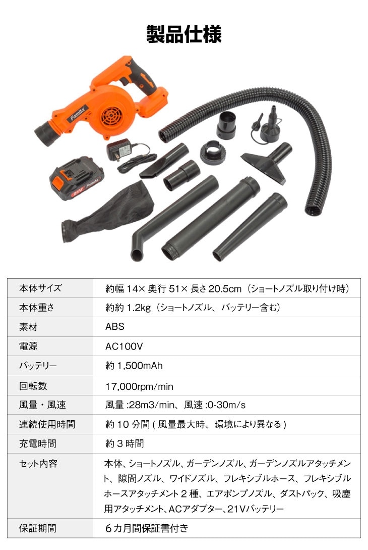 ●仕様/仕様:AC100V、充電時間:約3時間、連続使用時間(目安):約10分間(風量最大時、環境により異なる)、バッテリー容量:約1,500mAh、風量:28m3/min、回転数:17,000rpm/min、風速0-30m/s