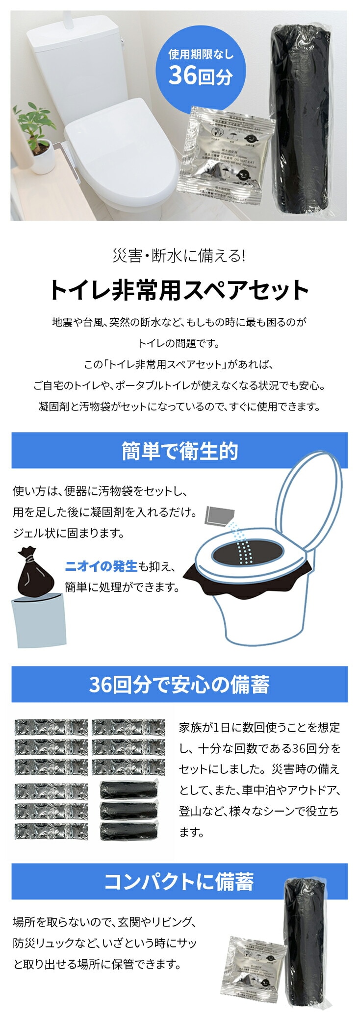家族が1日に数回使うことを想定し、十分な回数である36回分をセットにしました。災害時の備えとして、また、車中泊やアウトドア、登山など、様々なシーンで役立ちます。