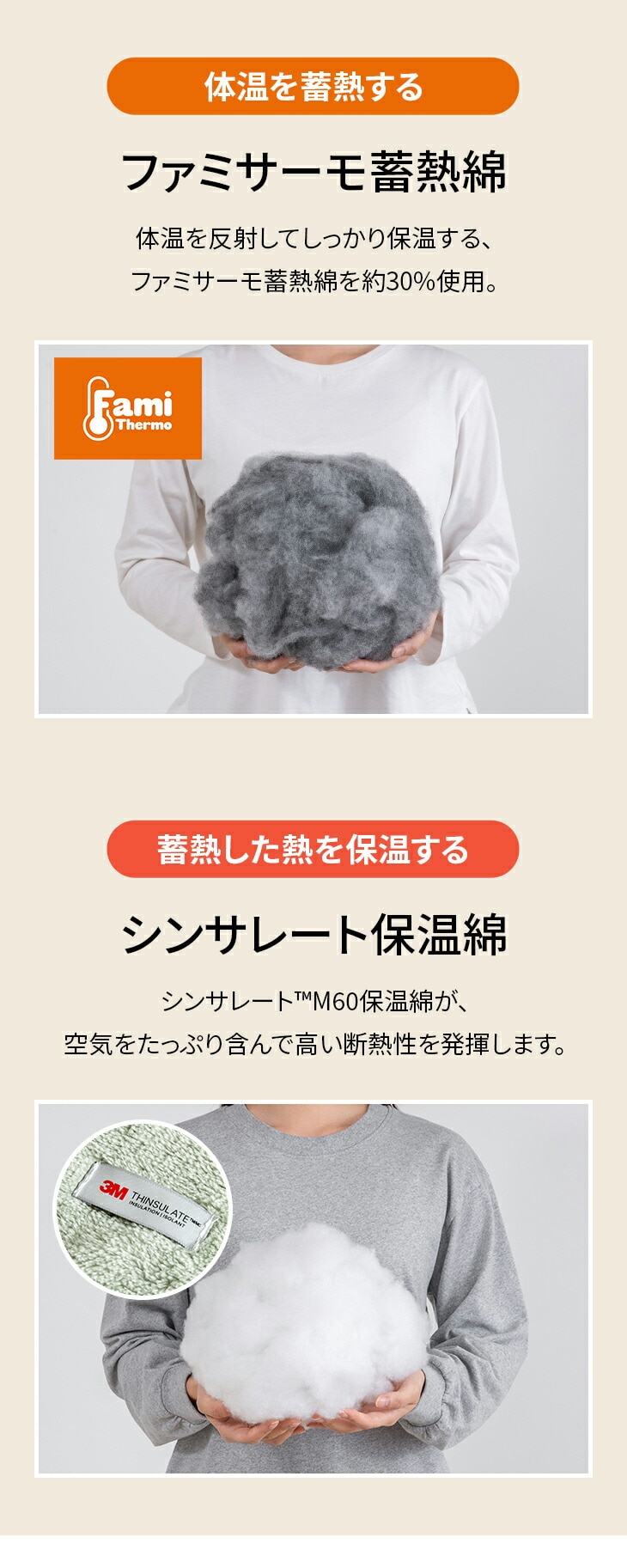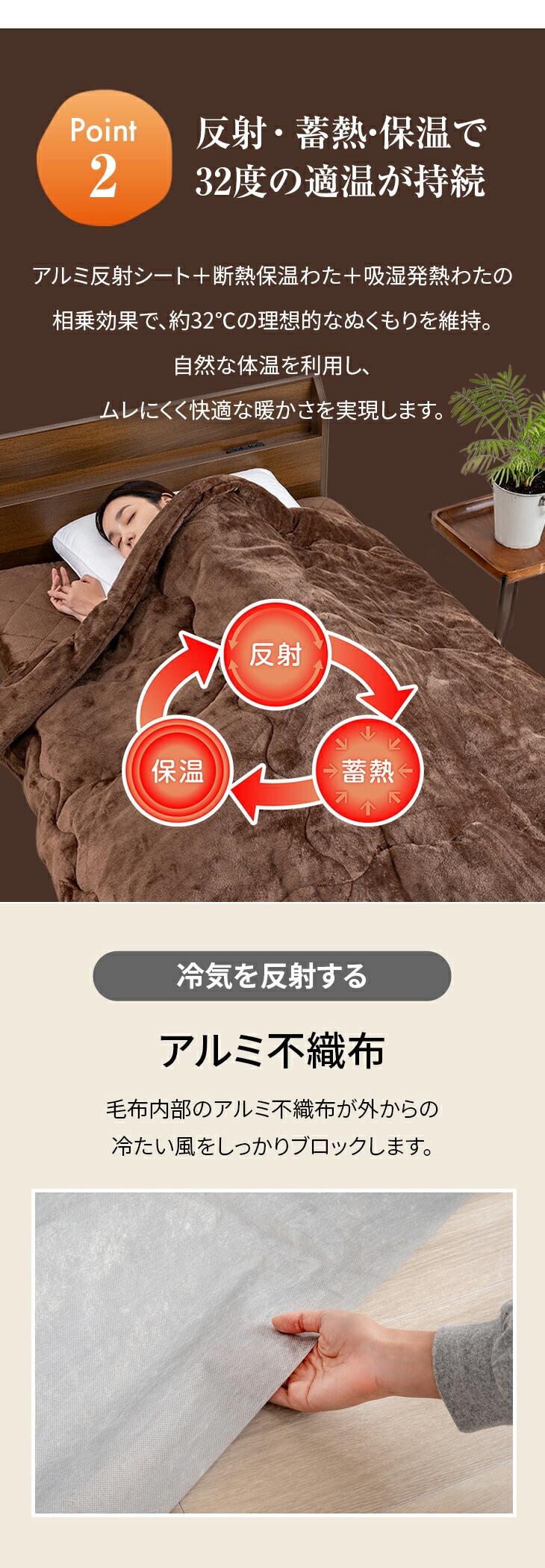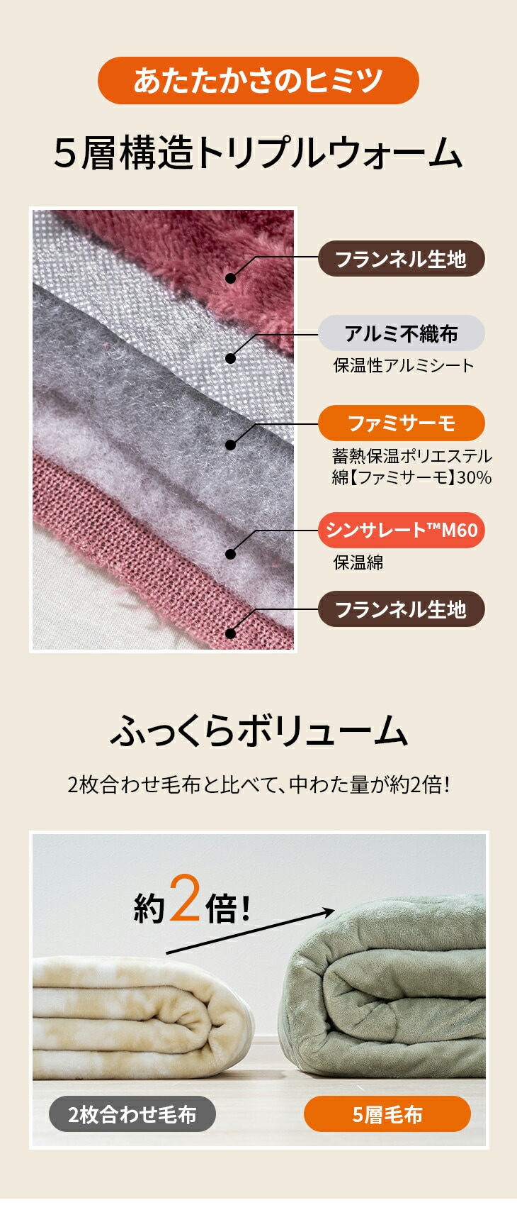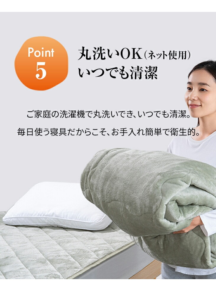 ●素材/[掛布団]第1層・第5層:フランネル生地、第2層:アルミ不織布(保温性アルミシート)、第3層:ポリエステル100%わた(蓄熱保温わたファミサーモ30%)、第4層:シンサレートM60(保温)、[敷パッド]第1層:フランネル生地、第2層:アルミ不織布(保温性アルミシート)、第3層:ポリエステル100%わた(蓄熱保温わたファミサーモ30%)、第4層:ポリエステル100%わた(吸湿発熱わた30%)、第5層:裏地(ポリエステル100%)