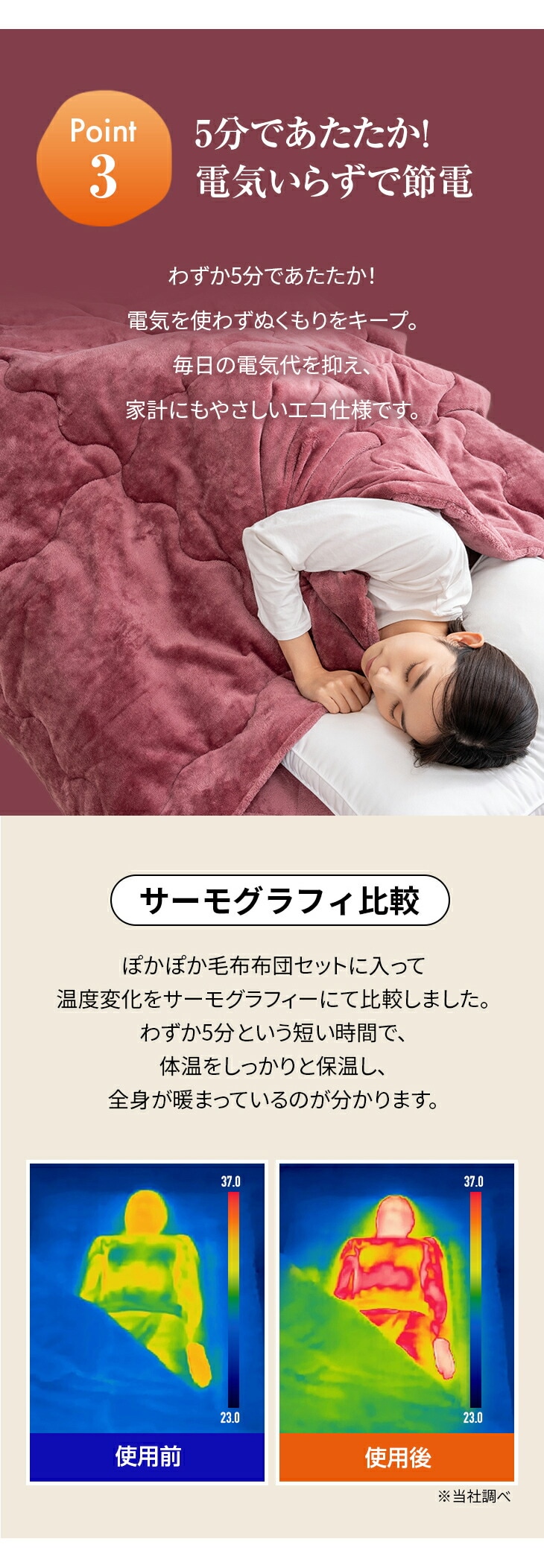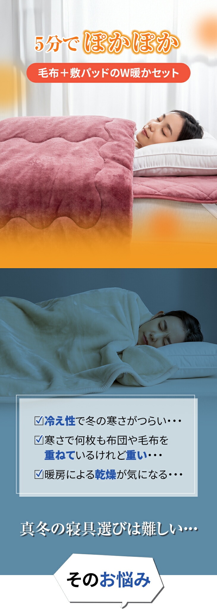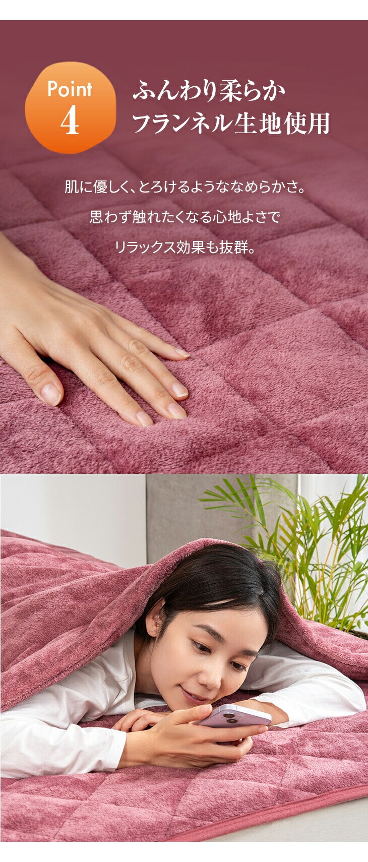 ●素材/[掛布団]第1層・第5層:フランネル生地、第2層:アルミ不織布(保温性アルミシート)、第3層:ポリエステル100%わた(蓄熱保温わたファミサーモ30%)、第4層:シンサレートM60(保温)、[敷パッド]第1層:フランネル生地、第2層:アルミ不織布(保温性アルミシート)、第3層:ポリエステル100%わた(蓄熱保温わたファミサーモ30%)、第4層:ポリエステル100%わた(吸湿発熱わた30%)、第5層:裏地(ポリエステル100%)