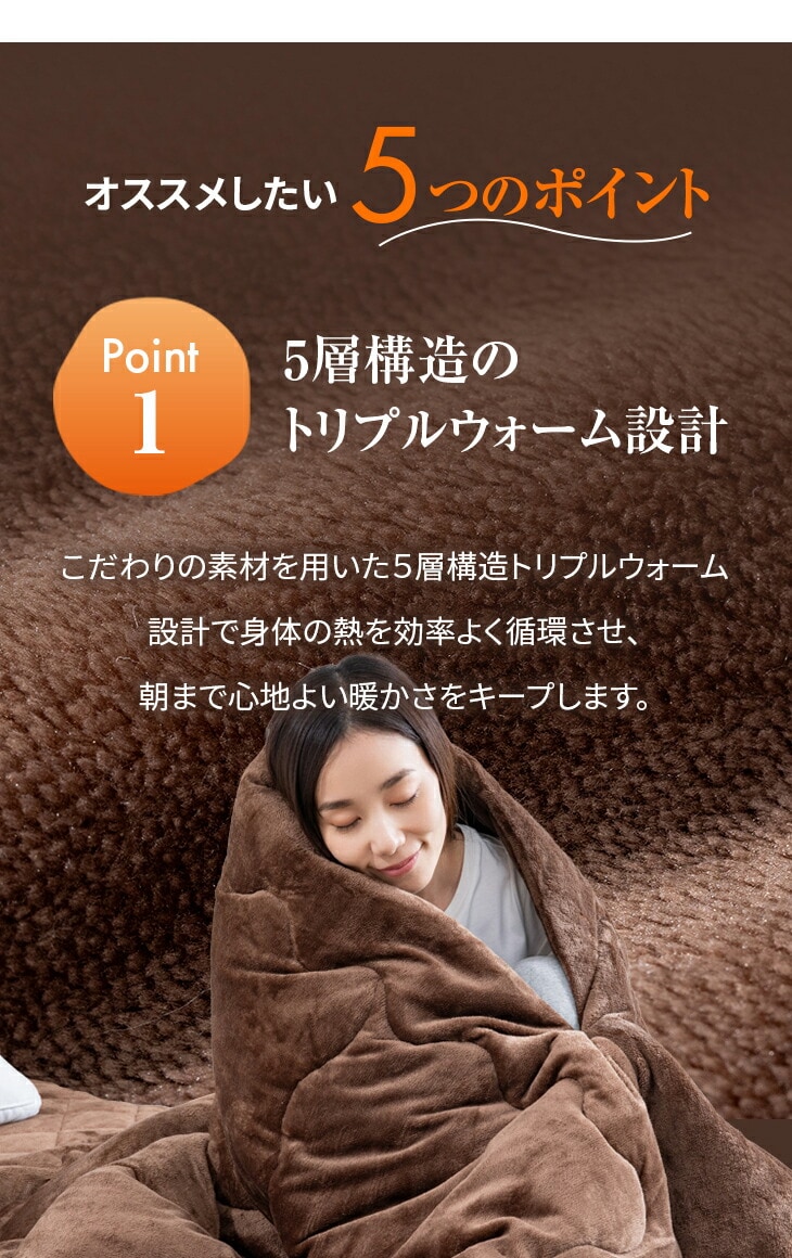 わずか5分でポカポカ!寒い夜も朝まで快適・快眠!「寝入りのヒヤッと感」や「夜中の冷え」にお悩みの方へ。柔らかなフランネル生地の心地よさはそのままに、冷たい外気を遮断し、体の熱を逃がさない機能に徹底的にこだわった5層構造の毛布布団セットです。このセットの秘密は、「蓄熱・保温・反射」のトリプルウォーム効果を狙った5層構造。体温を反射するアルミシート、断熱保温わたファミーサーモ、さらに敷パッドには吸湿発熱わたも使用し、わずか5分でポカポカの暖かさを実感できます。冬の就寝時に暖房器具への依存を減らせるため、毎日の電気代節約に大きく貢献し、家計にやさしい節電対策になります。実質、電気代0円で一晩中ぽかぽかです。
