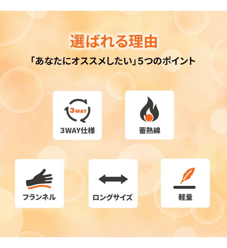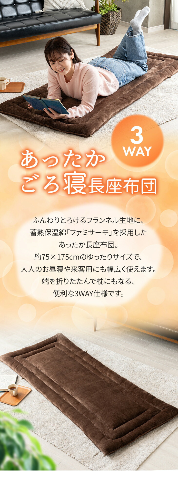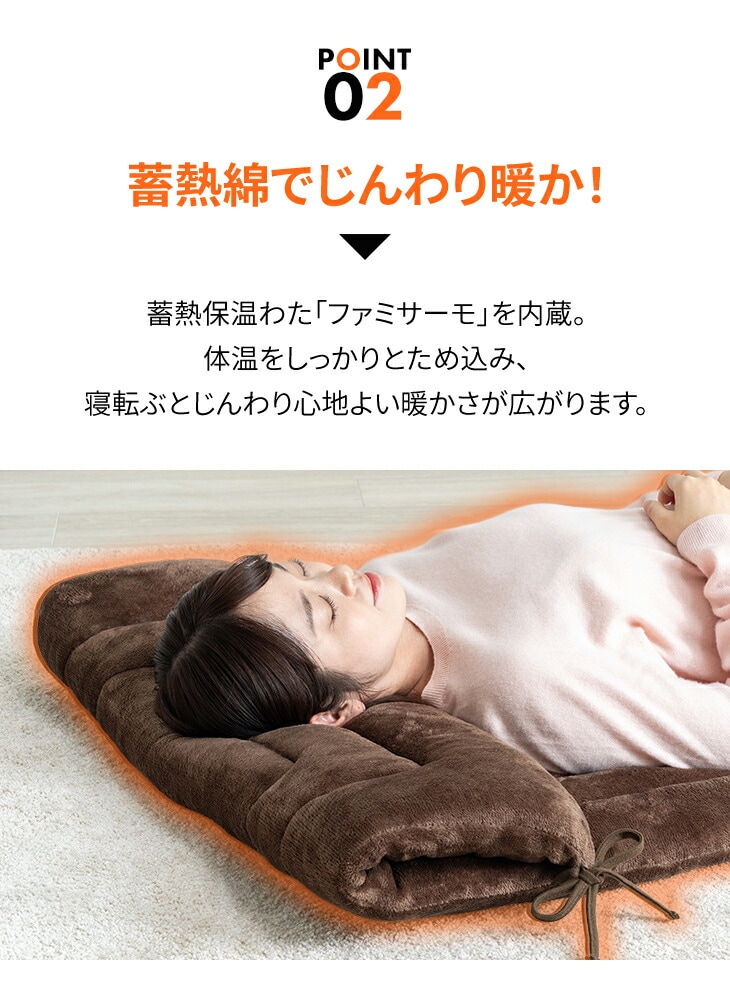 体から出る熱を吸収し蓄熱する素材「ファミサーモ」を柔らかな毛布地で挟んだ3層構造で暖かさをキープ。やわらかくとろけるような肌触り。折りたたんでヒモで結べば枕に早変わり!疲れた足の足枕としても大活躍します。