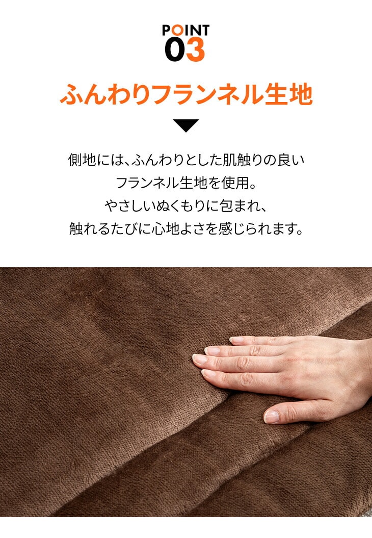 ●素材/側生地:ポリエステル100%(フランネル)、中綿:ポリエステル100%(蓄熱保温綿ファミサーモ30%)
