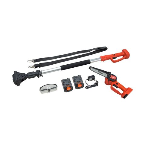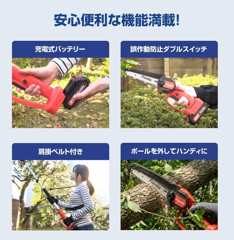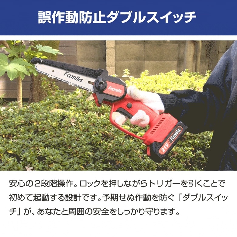 ファミラ 充電式コードレス2WAY高枝チェーンソー6点セット 予備バッテリー付き 高枝切り 枝切りチェーンソー ハンディチェーンソー ゴーグル付き 誤動作防止