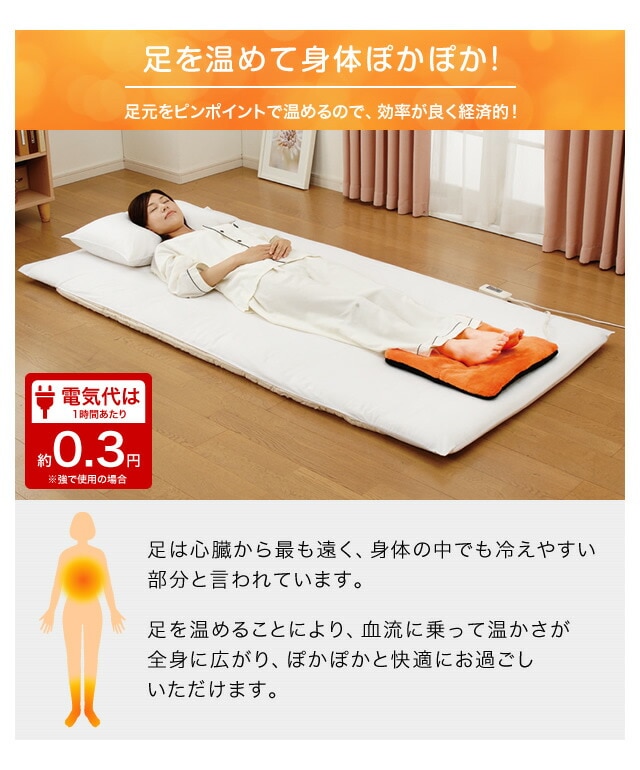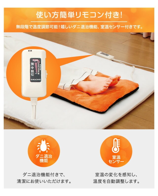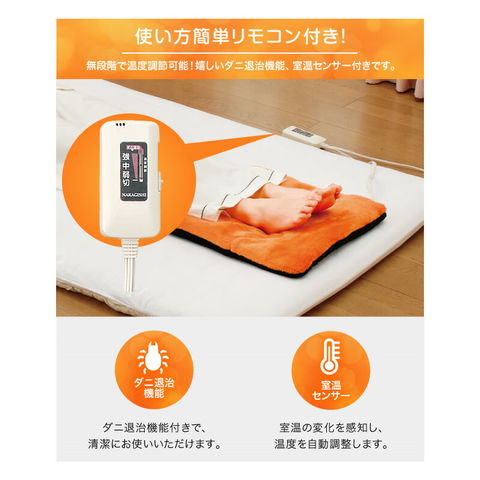 ダニ退治機能、温室センサー、簡単リモコン付き。電気代は1時間あたり約0.22円ととってもエコ。カバーは外して手洗いできます!カラーはオレンジ色とブラウンからお選びいただけます。安心の日本製です。