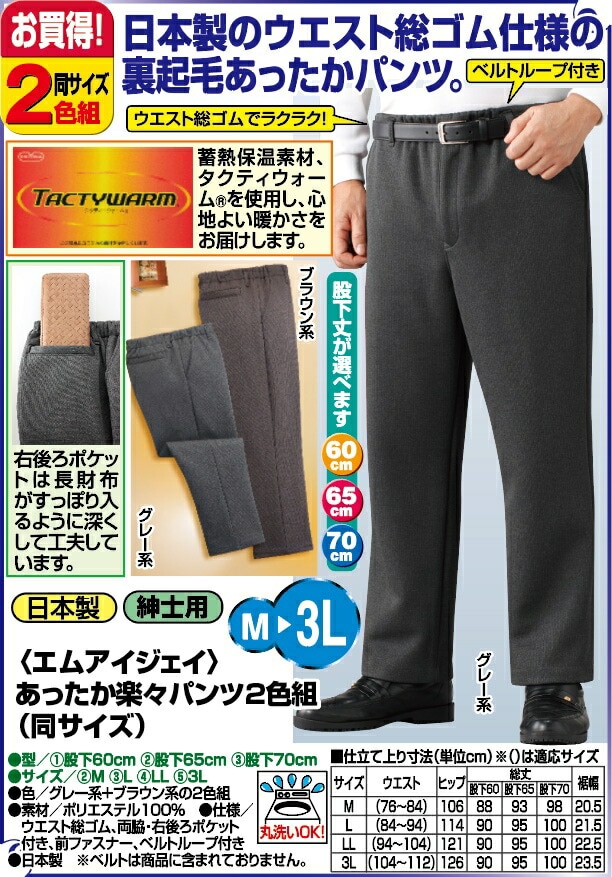 エムアイジェイ あったか楽々パンツ2色組 グレー ブラウン 同サイズ ウエストゴム メンズ シニア 裏起毛 パンツ あったかパンツ 暖か 蓄熱保温 タクティウォーム 日本製