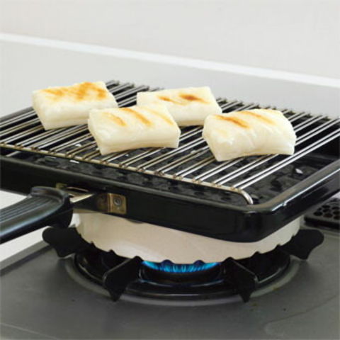 温度センサー付きのイライラをコレで解決!温度センサーがついたコンロでは使用できなかった焼き網を、ガスコンロと同じように使用できます。焼き台をコンロの五徳にのせて中央のくぼみに水を入れ、焼き網等をのせてガスを点火し、調理を開始するだけ。