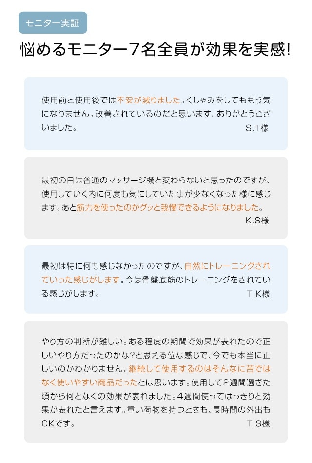 生殖器を支える重要な役割をしている尿道筋は、意識して動かしにくく、日常の生活の 中では刺激しにくい部位になります。細かい微振動が力の入れ方が難しい骨盤底筋を活性!骨盤底筋群に適した3D立体形状で1秒間に約40回の振動。お尻にやさしくフィットする低反発素材。