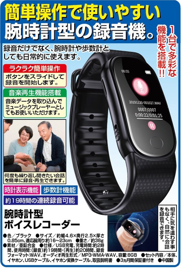 簡単操作で使いやすい腕時計型の録音機。 1台で多彩な機能を搭載! 録音だけでなく、腕時計や歩数計としても日常的に使えます。 ラクラク簡単操作、ボタンをスライドして録音を開始します。 音楽再生機能搭載、音楽データを取り込んでミュージックプレーヤーとしてもお使いいただけます。 何度も繰り返し聞きたい会話を簡単に録音・再生できます。 時計表示機能、歩数計機能、約19時間の連続録音可能、 相手に気を遣わす事もなく、自然に会話を録音できます。