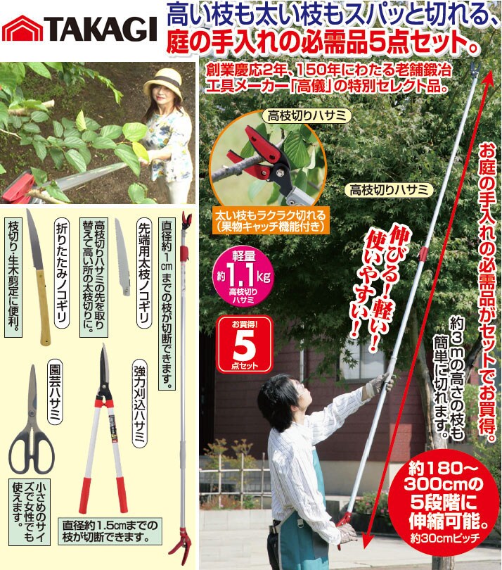 高い枝も太い枝もスパッと切れる、庭の手入れの必需品5点セット。創業慶応2年、150年にわたる老舗鍛冶工具メーカー「高儀」セレクトのお買得セットです。お庭の手入れの必需品がセットでお買得。約3mの高さの枝も簡単に切れます。