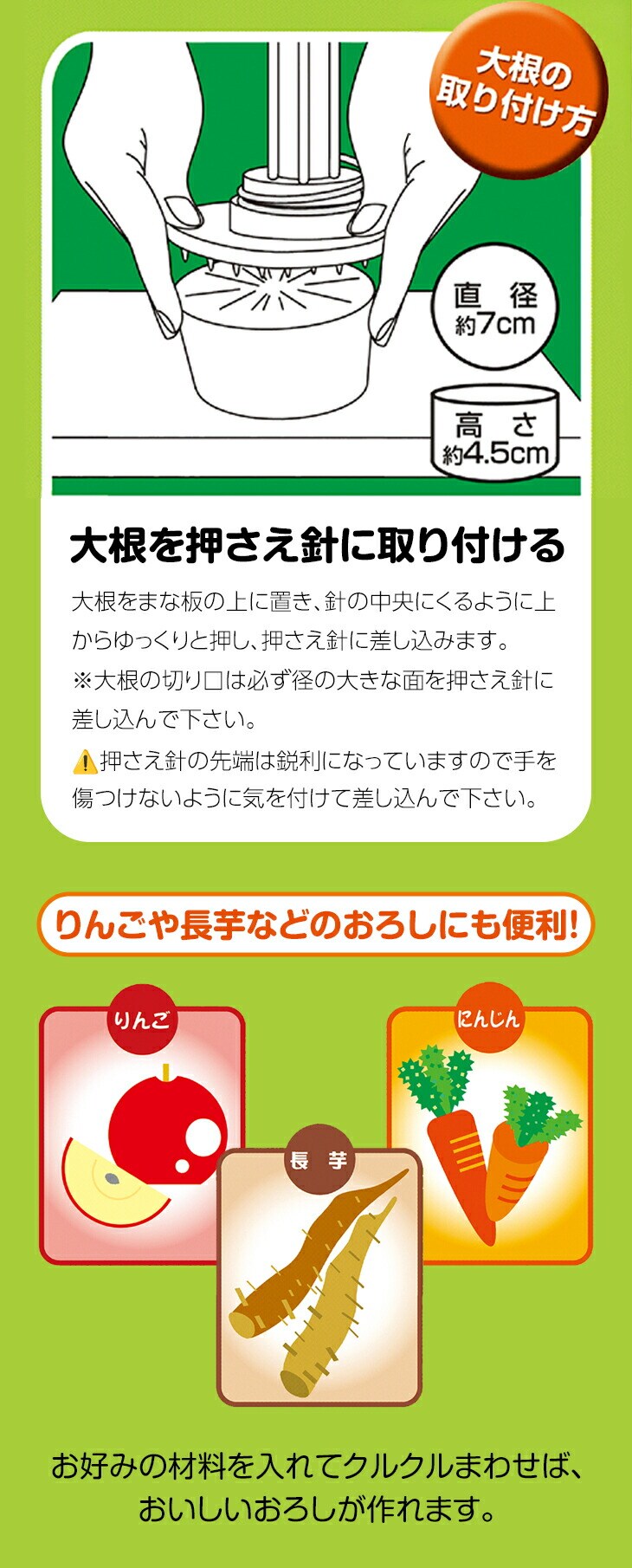 お年寄りや、指先の力が弱い方でも、ハンドルを軽く回すだけで簡単にふんわりとした美味しい大根おろしが作れます。