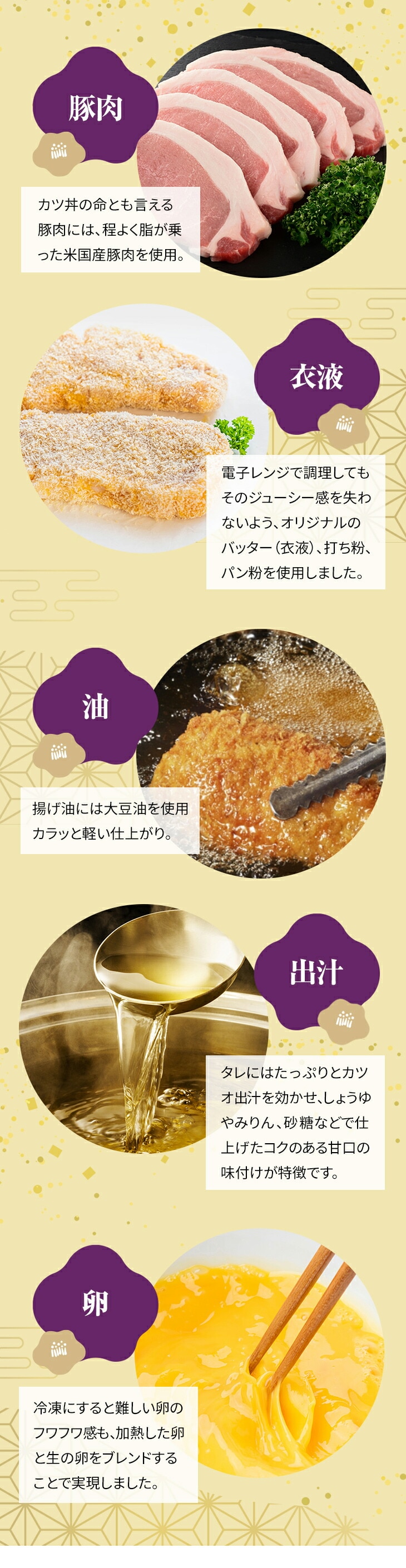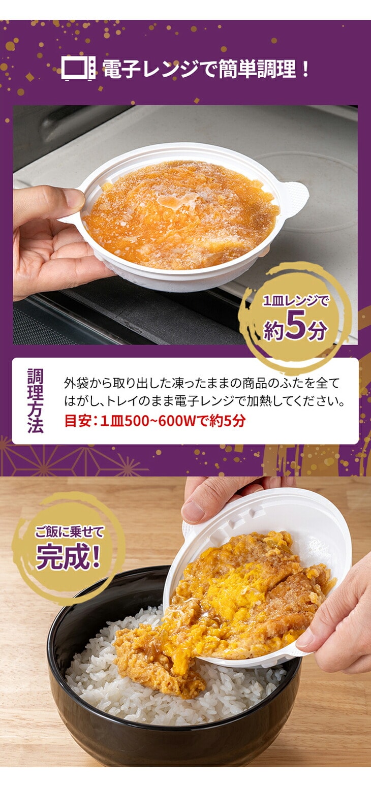 やわらかなトンカツにフワフワの卵と玉ねぎ、甘口の醤油ベースの特製タレがしみ込んだカツ丼の具。温めてご飯にのせれば、本格的なカツ丼が楽しめます。