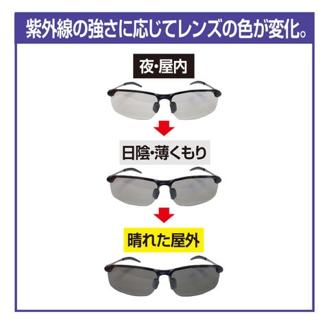 レンズの濃さを自動で調整。調光・偏光サングラス。太陽光や紫外線の強さに応じて色が変化する調光レンズを採用。さらに偏光機能により、乱反射のまぶしさを大幅にカット。画期的技術でスッキリ快適な視界を確保します。屋外・屋内での掛け外しが面倒という方にお薦め。男女兼用タイプ。約99%以上UVカット率※メーカー調べ。