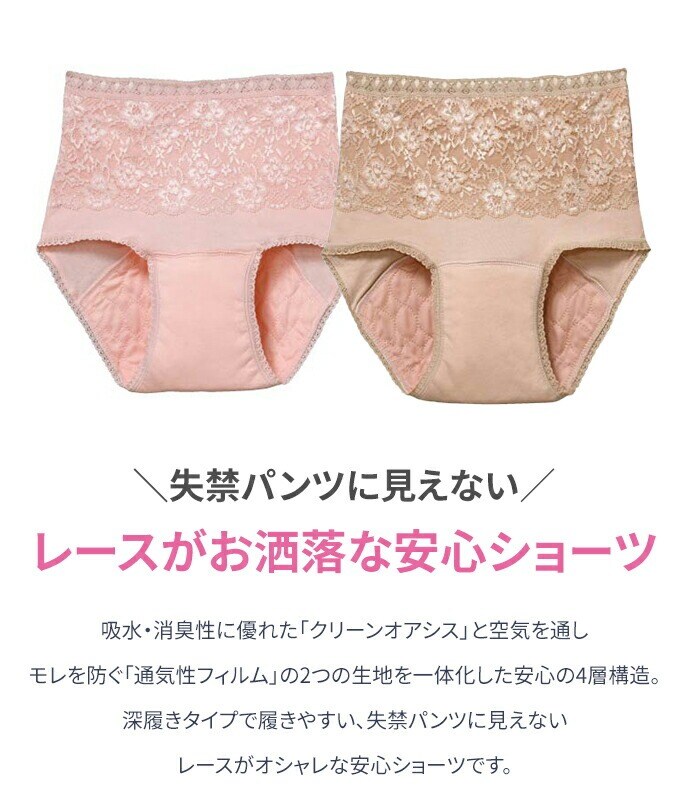 深ばきタイプで穿きやすい「失禁ショーツに見えない」レースがお洒落な安心ショーツです。吸水・消臭性に優れた「クリーンオアシス」と空気を通しモレを防ぐ「通気性フィルム」の2つの生地を一体化した安心の4層構造。大きめの吸水パッドが不意の横モレを防止。吸水量目安約50ml(軽失禁用)※吸水量目安:メーカー調べ