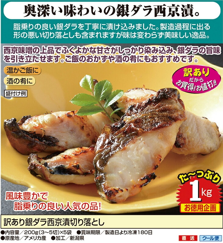 訳あり 銀だら 西京漬け 切り落とし 冷凍 200g 3~5切 ×5袋 銀ダラ 西京味噌 味噌漬け 西京焼き 焼き魚