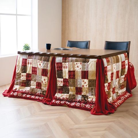 場所をとらない省スペースタイプのこたつ布団。コーナー部分がスリット仕様で裾が広がらずお部屋を広く使えます。パッチワーク調のお洒落なノルディック柄。