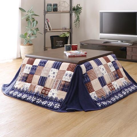 場所をとらない省スペースタイプのこたつ布団。コーナー部分がスリット仕様で裾が広がらずお部屋を広く使えます。パッチワーク調のお洒落なノルディック柄。