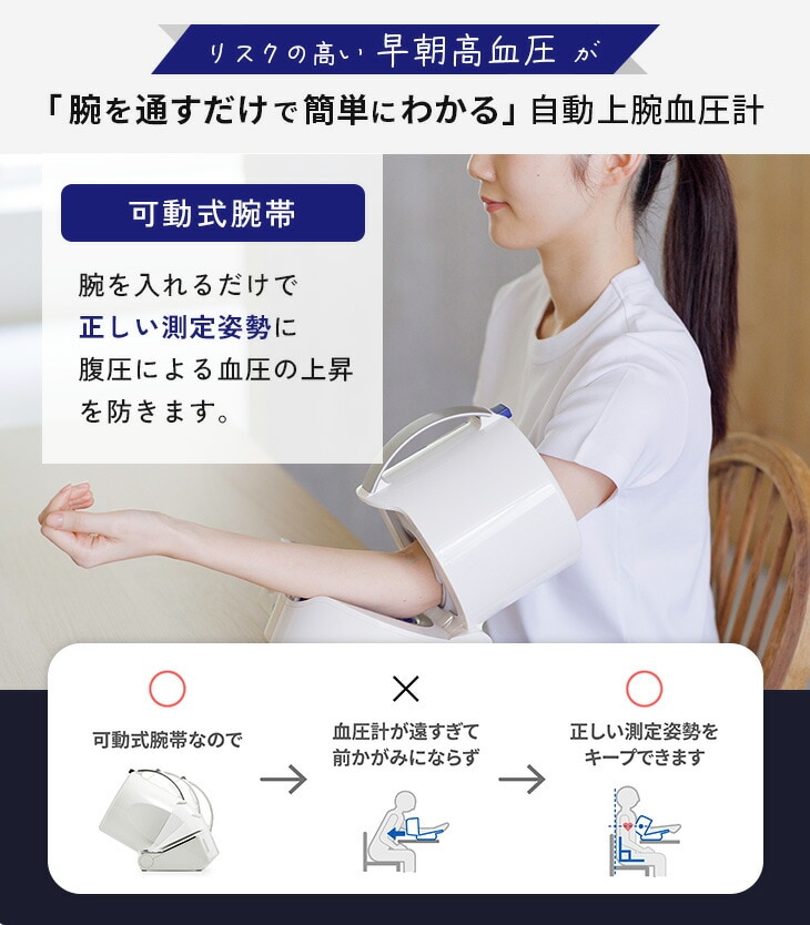 腕を通すだけで正しい測定姿勢を作る「可動式腕帯」。