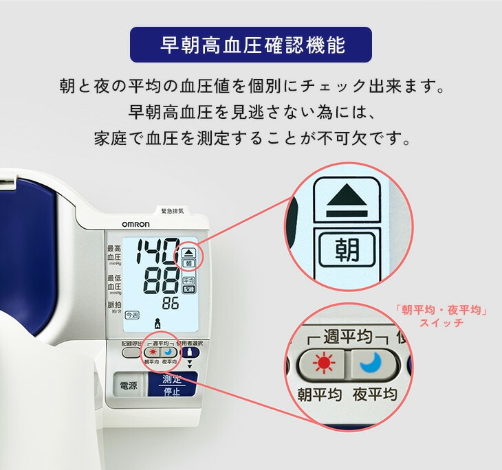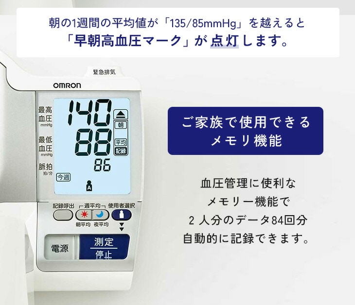 朝の1週間の平均値が「135/85mmHg」を越えると「早朝高血圧マーク」が点灯。朝と夜に測定した血圧を個別に管理できる「朝平均ボタン」「夜平均ボタン」付き。