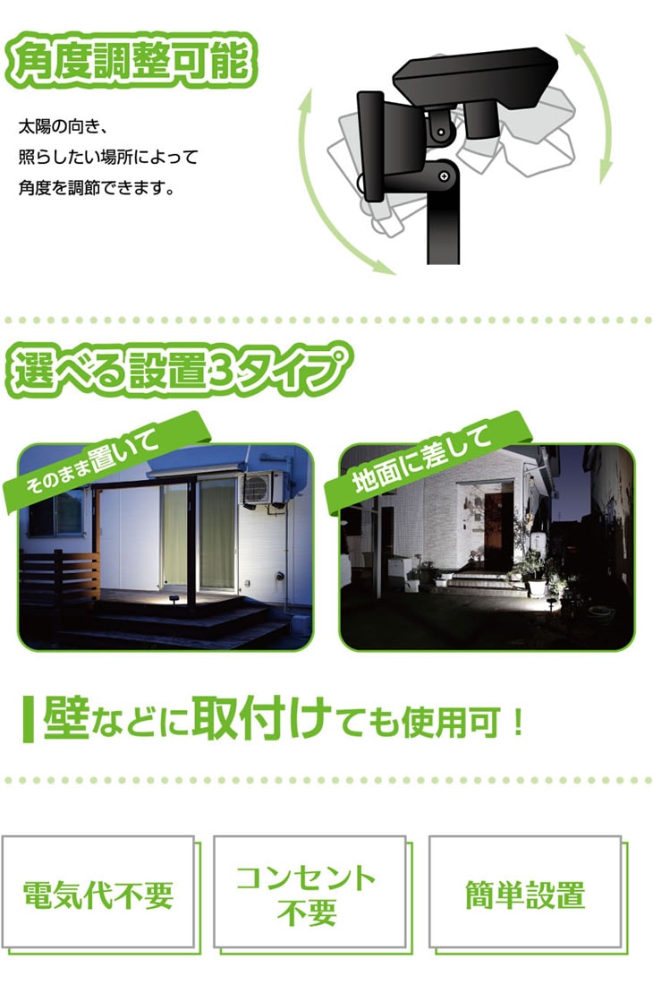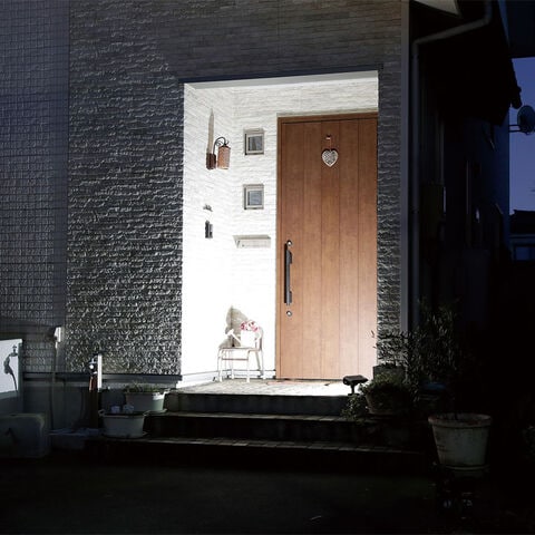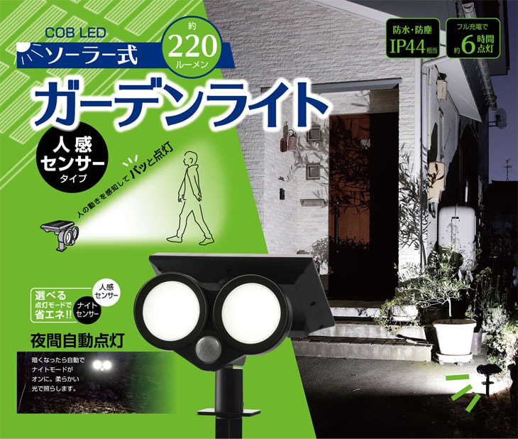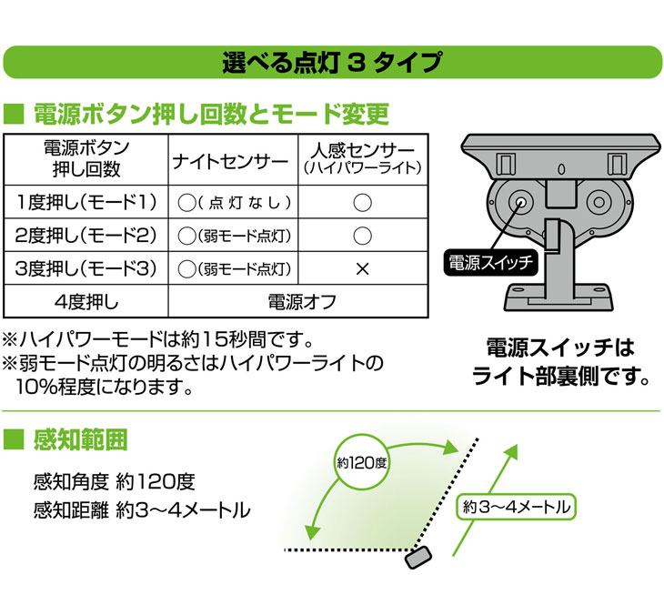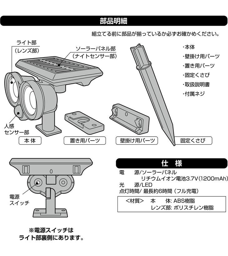 ●仕様/電源:ソーラーパネル・リチウムイオン電池、光源:LED、点灯時間:最長6時間(フル充電/弱点灯時)、感知範囲:感知角度/約120度・感知距離/約4m、防水・防塵:IP44相当、付属品:アンカーネジ・取付けネジ