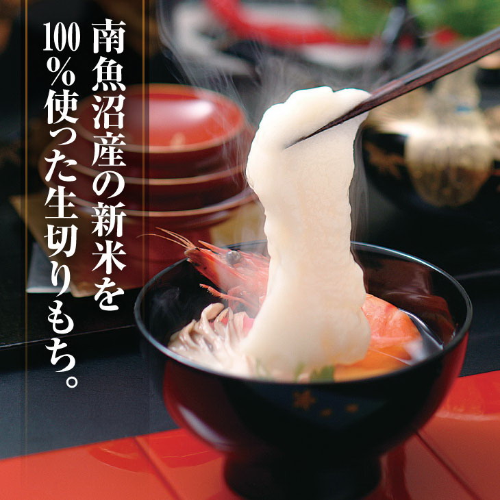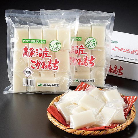 生産量の少ない「南魚沼産こがねもち」の新米(もち米)を使用し、昔ながらの杵つき工法でつき上げた大変希少な生切りもちです。こだわり製法で仕上げたお餅は「粘り・コシ」が強く煮ても溶けにくいので雑煮や鍋物などに最適です。包装は保存に強く便利な個包装です。