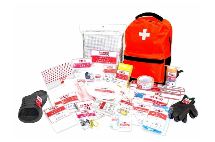 ●セット内容/リュックサック、緊急用ホイッスル、2WAYドライバー、カッター、圧縮袋、予備袋、筆記用具セット、歯ブラシ×3本、綿棒×20本、マスク×3枚、携帯トイレ×3個、45Lポリ袋×3枚、紙皿×3枚、プラカップ×5個、割り箸×5膳、スプーン・フォークセット、2WAY懐中電灯、ラバー手袋、お薬ケース、布テープ、レインポンチョ、サンダル、アルミシート、アルミブランケット、エア枕、非常用給水バッグ、ラップ、アルミホイル、ボディタオル、ティッシュ