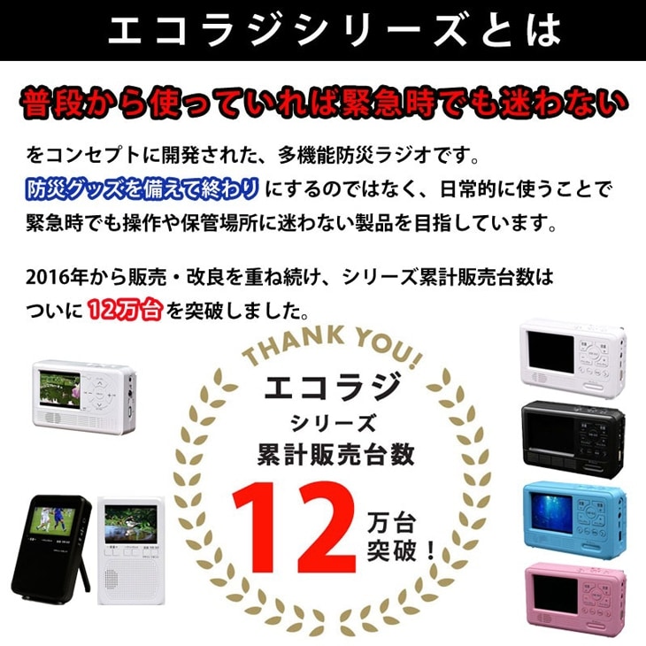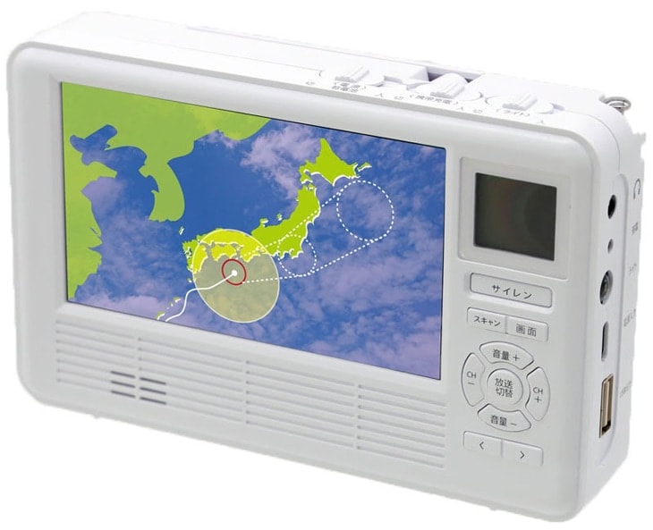●仕様/電源:(入力)AC100V(出力)DC5V、単4形アルカリ乾電池4本使用(別売)・内蔵電池/リチウムポリマー電池3.7V・2000mAh、受信周波数:ワンセグTV/UHF470~770MHz・FMラジオ/76~108MHz・AMラジオ/522~1710kHz・短波ラジオ/3.9~21.85MHz(10区分)、スピーカー:2W×1、端子:イヤホン用3.5mmステレオ端子・携帯充電用USB出力端子(TypeA)・本電源用USB入力端子(Type-C)、LEDライト:輝度40-50ルーメン、サイレン:80-90db、カラー液晶4.3インチ