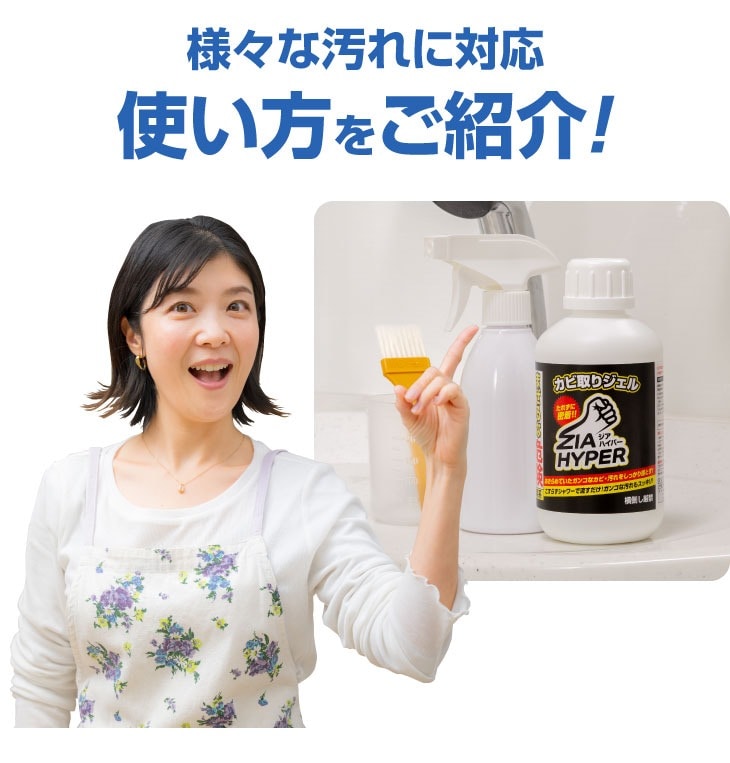 ●セット内容/ジアハイパー×2、計量カップ200ml×1、カビ取り剤用刷毛×1、希釈ボトル300ml×1、ビニール手袋×2