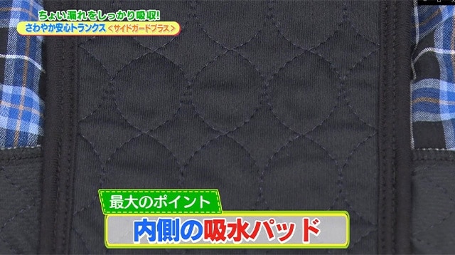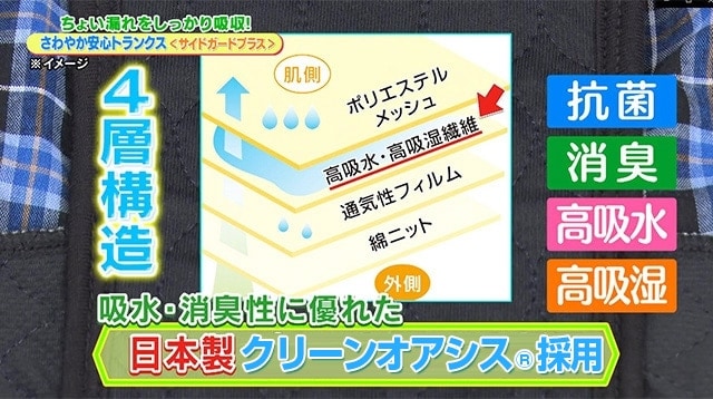 ただのトランクスじゃない。失禁パンツに見えない失禁トランクス。ちょい漏れのシミや匂いをおさえる4層構造の吸水パット・日本製ピュアブリーズを採用。吸水・消臭性に優れています。サイドにもパットがあり、横漏れも防いでくれ、1日穿いていても漏れが気になりません。トランクスタイプでゆったり感がありながら、幅広ハンモック構造でトランクスの解放感はそのままに、安心感があります。