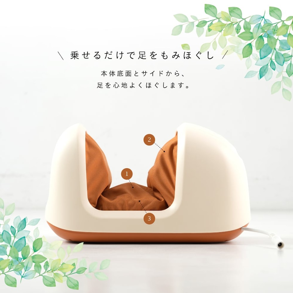 本体底面の突起付回転ローラーとサイドの立体クッションの異なる2種類のマッサージ機能でしっかりもみほぐします。突起付き回転ローラーは、底面のローラーが足裏全面を広くほぐし、突起でコリを細かく押しほぐします。立体クッションは、足をサイドから大きく包み込み、立体的な動きで足先から血流を促進します。