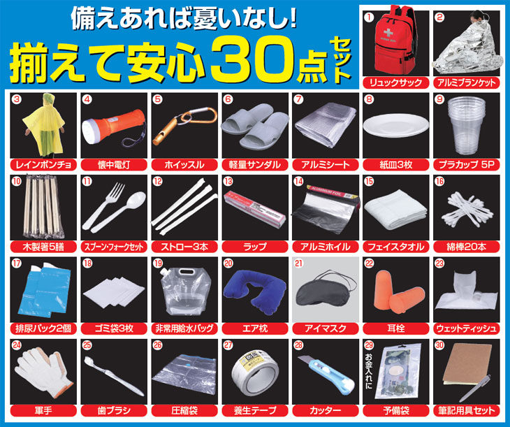 30点セット:リュックサック、アルミブランケット、レインポンチョ、懐中電灯、ホイッスル、軽量サンダル、アルミシート、紙皿×3枚、プラカップ×5個、木製箸×5膳、スプーン+フォークセット、ストロー×3、ラップ、アルミホイル、フェイスタオル、綿棒×20本、排尿パック×2個、ゴミ袋×3枚、非常用給水バッグ、エア枕、アイマスク、耳栓、ウェットティッシュ、軍手、歯ブラシ、圧縮袋、養生テープ、カッター、予備袋、筆記用具セット