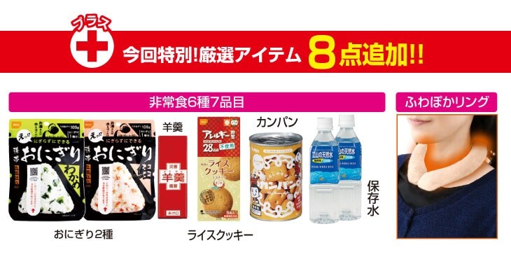 食品セットで、当面の食料も確保:おにぎり、カンパン、ようかんなど、すぐに食べられる非常食と、5年保存できる天然水付き。