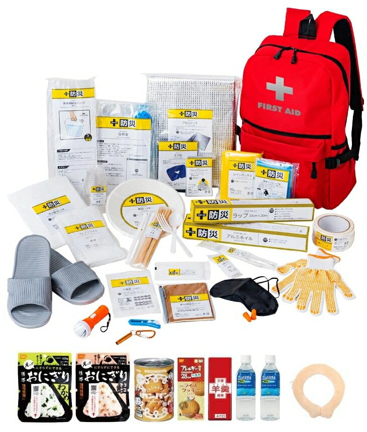 ●セット内容/30点セット:リュックサック・アルミブランケット・レインポンチョ・懐中電灯・ホイッスル・軽量サンダル・アルミシート・紙皿×3枚・プラカップ×5個・木製箸×5膳・スプーン+フォークセット・ストロー×3・ラップ・アルミホイル・フェイスタオル・綿棒×20本・排尿パック×2個・ゴミ袋×3枚・非常用給水バッグ・エア枕・アイマスク・耳栓・ウェットティッシュ・軍手・歯ブラシ・圧縮袋・養生テープ・カッター・予備袋・筆記用具セット、食品セット:おにぎり(鮭×1、わかめ×1)・ライスクッキー8枚入×1・立山の天然水(500ml×2本)・備蓄カンパン×1缶・備蓄ようかん×1本、ふわぽかリング×1個、洗えるあったか3WAY寝袋×1個
