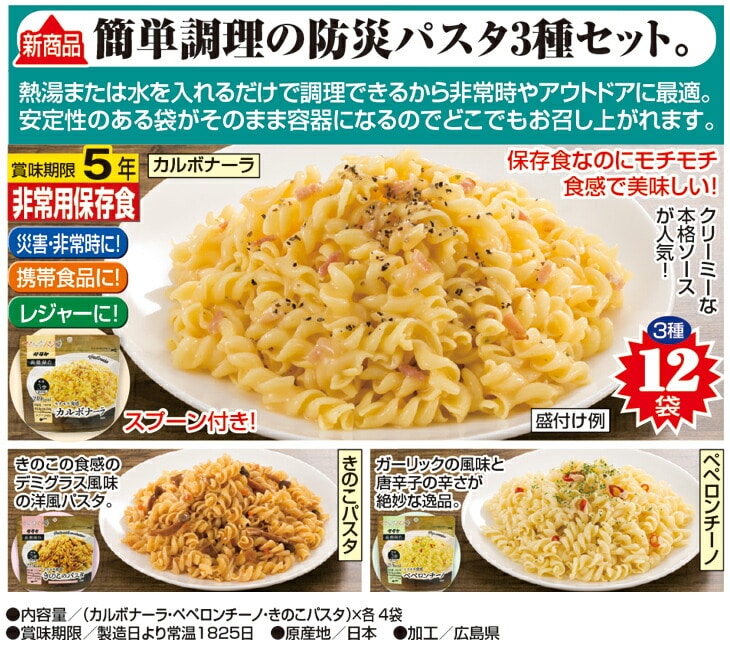 マジックパスタ 保存食セット 12袋 3種各4袋セット 国内製造 アルファ化加工 パスタ カルボナーラ きのこパスタ ペペロンチーノ 防災 非常用 保存食 携帯食品 災害 備蓄 非常食 賞味期限5年