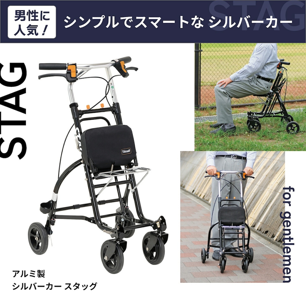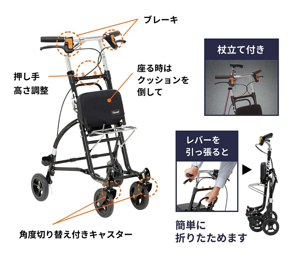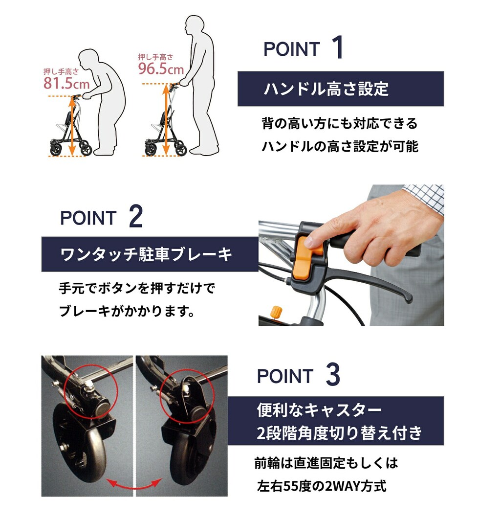 便利なキャスター2段階角度切り替え付き、ワンタッチ駐車ブレーキで簡単操作