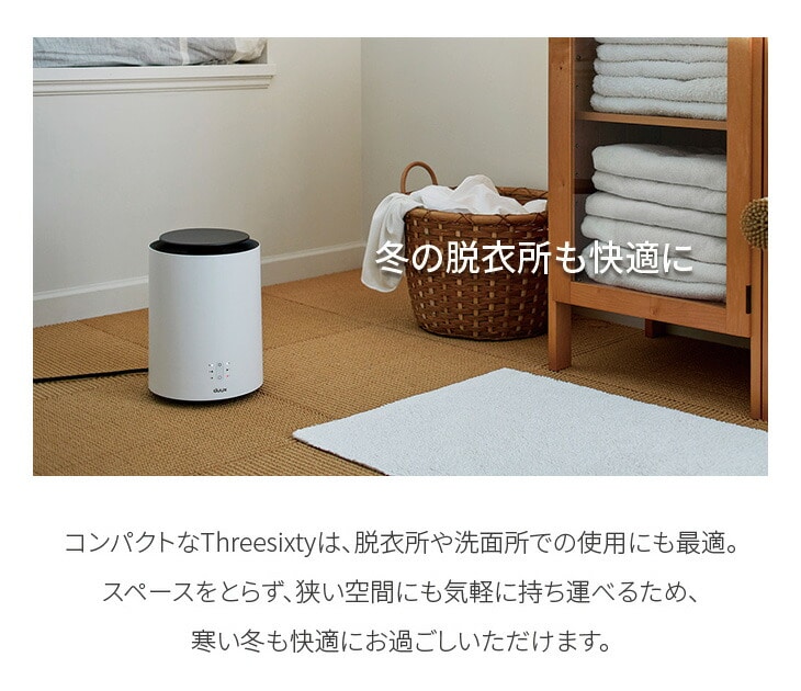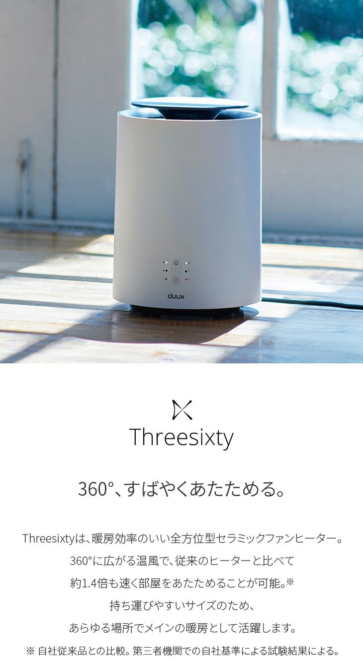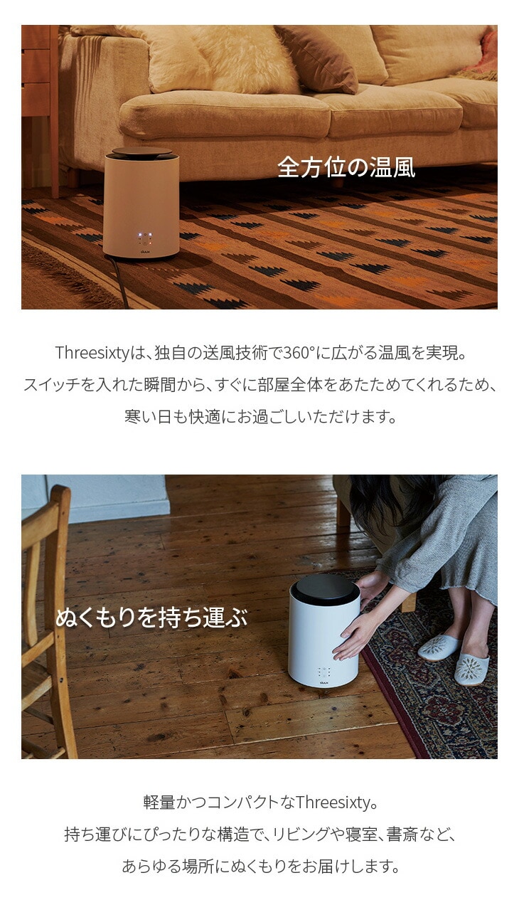 Threesixtyは、暖房効率のいい全方位型セラミックファンヒーター。360度に広がる温風で、従来のヒーターと比べて約1.4倍も速く部屋をあたためることが可能。持ち運びやすいサイズのため、あらゆる場所でメインの暖房として活躍します。