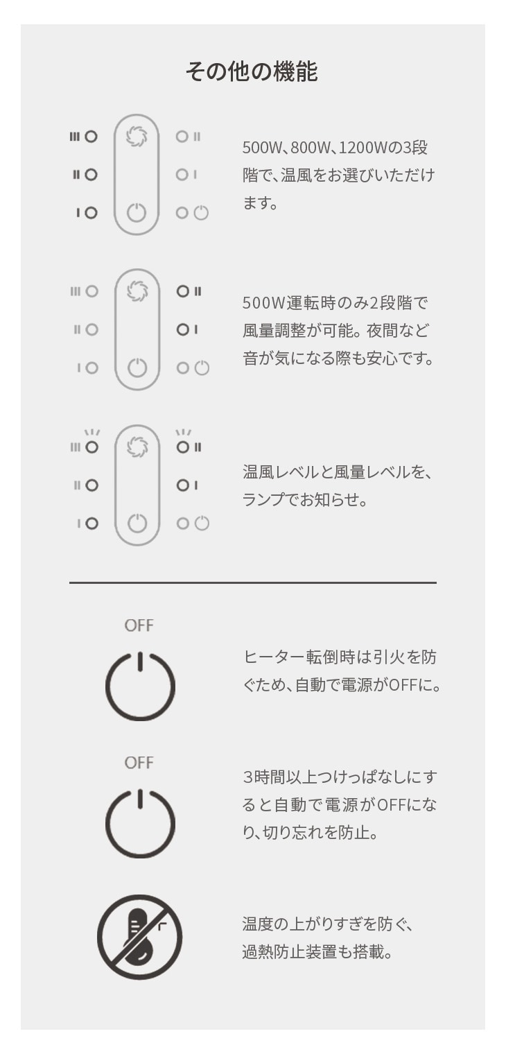 ●仕様/電源:AC100V 50/60Hz、消費電力:強/1200W 中/900W 弱/500W 運転騒音:50dB以下、木造住宅:断熱材なし 約3畳(4.9m2)まで、断熱材50mm 約6畳(8.6