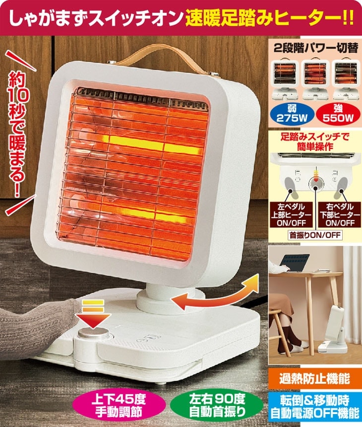 寒い季節、あなたの足元を素早く温める「足踏みスイッチヒーター」が登場!このヒーターは、しゃがまずスイッチオンが可能で、約10秒で暖まる驚きの速暖性能を誇ります。使い方は簡単。足踏みでON/OFFができるため、面倒な操作はいりません。さらに、上下45度の手動調節と、左右90度の自動首振り機能で、広い範囲をしっかりと暖めます。過熱防止機能や転倒時、移動時の自動電源OFF機能を搭載しているため、家族みんなが安心して使えます。