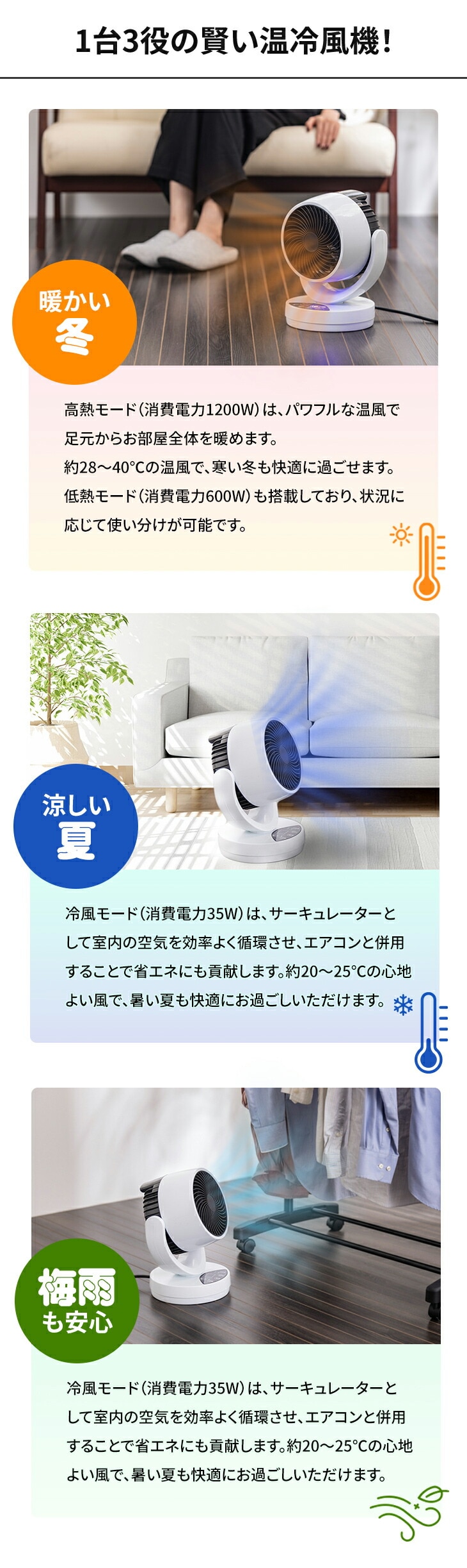 2.涼しい夏に: 冷風モード(消費電力35W)は、サーキュレーターとして室内の空気を効率よく循環させ、エアコンと併用することで省エネにも貢献します。約20~25℃の心地よい風で、暑い夏も快適にお過ごしいただけます。