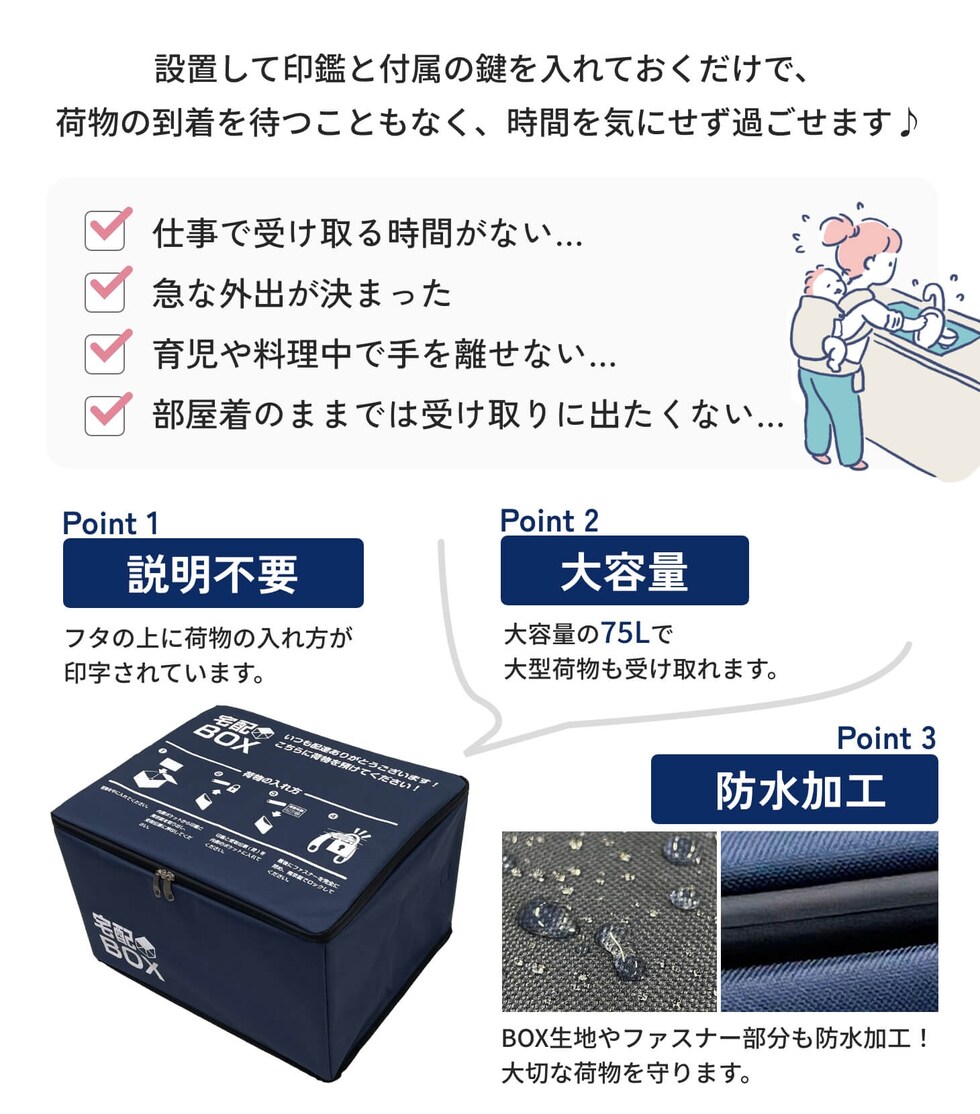 設置して印鑑と付属の鍵を入れておくだけで、荷物の到着を待つこともなく、時間を気にせず過ごせます♪