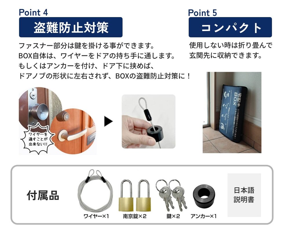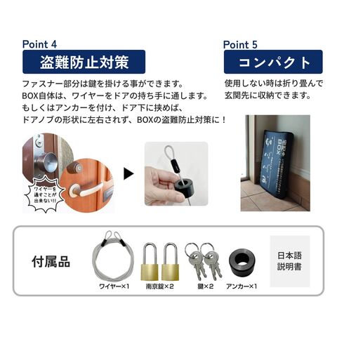 ●セット内容/宅配ボックス本体、セキュリティーワイヤー×1、南京錠×2、鍵×2、専用アンカー×1、取扱説明書