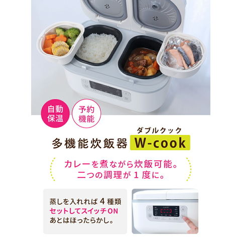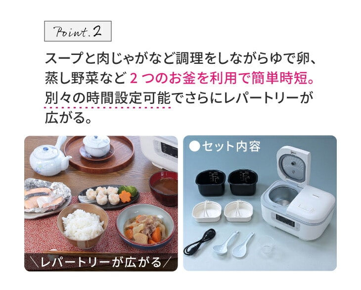 ・スープと肉じゃがなど調理をしながらゆで卵、蒸し野菜など2つのお釜を利用で簡単時短。別々の時間設定可能でさらにレパートリーが広がる。