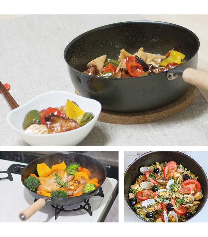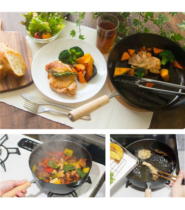 ●素材/共通:本体/鉄(底の厚さ:約1.2mm)、クリア塗装(ご使用前に空焼き必要)、ハンドル/木柄