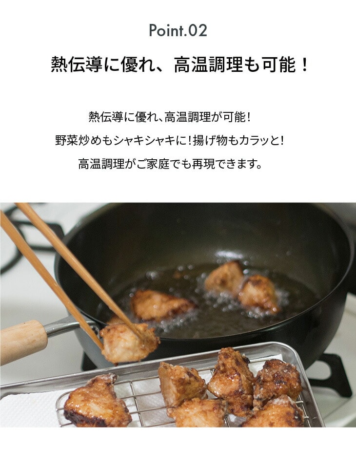 熱伝導に優れ、高温調理が可能!野菜炒めもシャキシャキに!