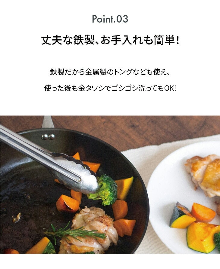 鉄製だから金属製のトングも使え、使った後も金タワシでゴシゴシ洗ってもOK。