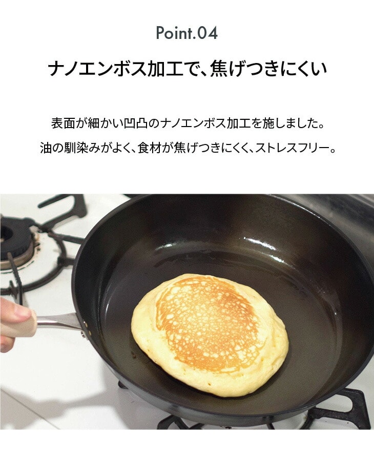 表面が細かい凹凸のナノエンボス加工。油の馴染みがよく、食材がくっつきにくくストレスフリー。