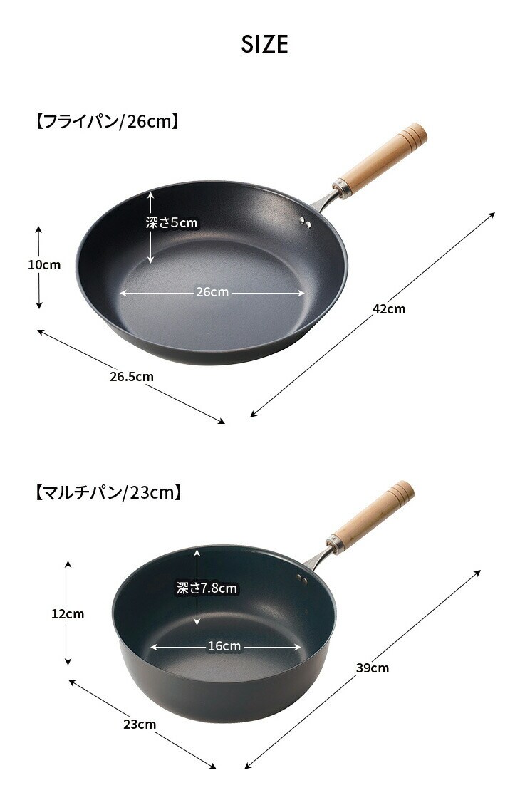 ●サイズ/フライパン26cm:約幅26.5×奥行42×高さ10cm、内寸/底面直径26cm、深さ5cm、マルチパン23cm:約幅23×奥行39×高さ12cm、内寸/底面直径16cm、深さ7.8cm